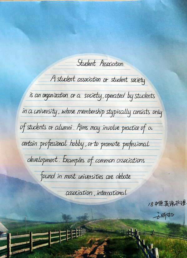 11月2日,在基础部外语教研室的组织下,围绕2018级化工、机电、养老护理三个专业的中德班学生,开展了一次别具一格的活动——英文书法比赛。三个中德班的同学热情高涨,积极参赛,认真书写,经过英语教师的耐心指导与反复修改,最终完成了参赛作品。
