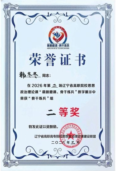 近日,2026年第二场辽宁省高职高专院校思想政治理论课“萌新磨课、骨干练兵”教学展示决赛圆满落幕。我校思政教研部教师张阔、韩冬冬凭借扎实的专业功底与精巧的教学设计,分别斩获“萌新磨课”组二等奖、“骨干练兵”组二等奖,为学校赢得荣誉。