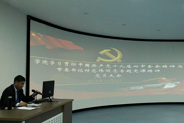 11月5日13:30,学院召开学习宣传贯彻中国共产党十九届四中全会精神和市委书记付忠伟“不忘初心、牢记使命”主题教育专题党课精神大会,学院党委书记王正东专题传达四中全会精神和付...